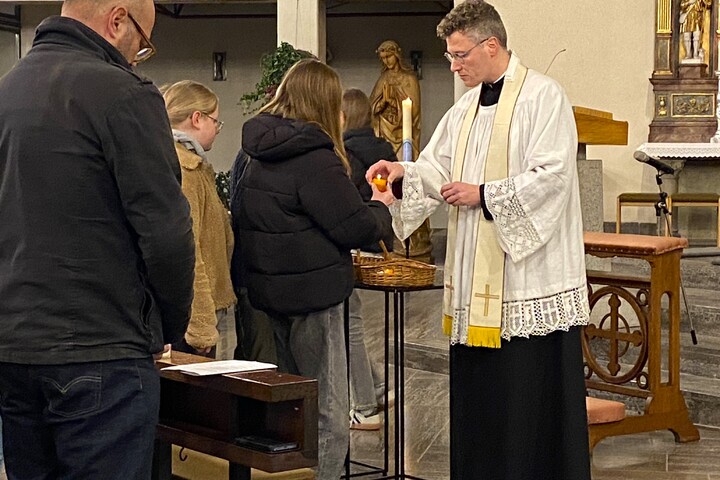 Den Weg zum Empfang des Firmsakraments haben die Jugendlichen aus dem Schweinfurter Oberland mit einer Andacht am Abend des 7. November begonnen. Den Gebetsgottesdienst leitete Pfarrer Dr. Eugen Daigeler; er bestand aus einer kurzen Predigt zum Thema "Wer ist Jesus für mich?" und einem Gebet vor dem Allerheiligsten. Die Firmkandidaten entzündeten Kerzen für ihre Bitten.