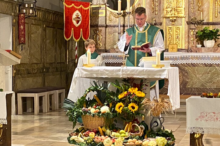 Prächtige Erntealtäre waren in unseren Kirchen von Ehrenamtlichen aufgebaut worden. Früchte, Gemüse und Blumen zeugen von der Schönheit der Schöpfung und dem Reichtum der Gaben Gottes. Erst in der Haltung der Dankbarkeit kann man sie wirklich genießen, indem man sich daran freut, indem man erkennt, dass nichts selbstverständlich ist, und indem man die Spuren von Gottes Güte darin sieht.